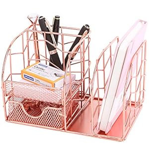 Nugorise Desk Accessories Organizer, 5 Slots – Letter Sorter, Pen Holder, Sticky Note Holder and Accessory Slot, Wire Stationery Storage Caddy with Drawer for Office Supplies, Rose Gold