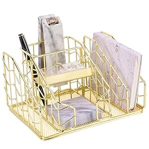 Nugorise Desk Accessories Organizer, 6 Slots – Letter Sorter, Pen Holder, Sticky Note Holder and Accessory Slot, Wire Stationery and Office Supplies Storage Caddy, Gold