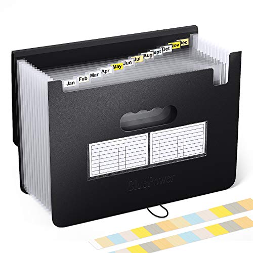 BluePower Filing Box 12 Pockets,Letter Size Expanding File Folder, Plastic File Folders with Labels,Monthly Accordion Document Organizer Adjustable Buckle,A4 Portable Accordian Paper/Bill/Receipt Bag