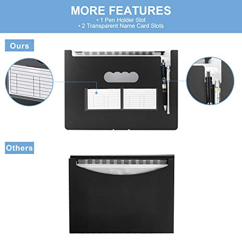 ๐Ÿ“ UNIQUE DESIGN -Accordian file file organizer is advanced than other traditional briefcase.Our file organizer is 12 individual pockets with cover, and enough long cord flexible elastic closer for safer storage, besides humanized pen holder design, never worry about papers or pens lost, 2 transparent name card slots displayed on the front page.