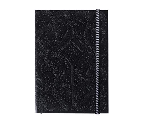 A5 JOURNAL – The Christian Lacroix Black Paseo A5 Journal from Galison measures 6” x 8”. It’s a layflat notebook that’s embossed with an all-over Paseo design on a beautiful faux leather cover. Includes a striped elastic closure and a ribbon marker.