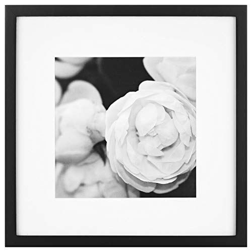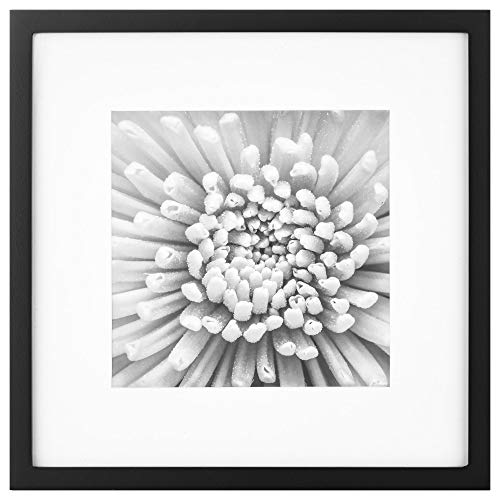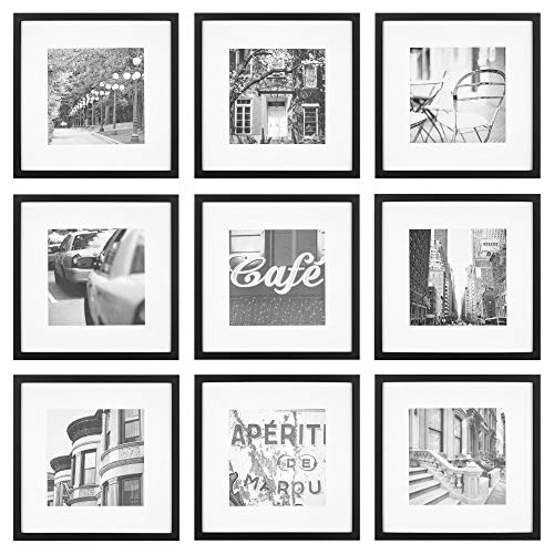 Nine square photo frames in black wood with removable classic white mats
