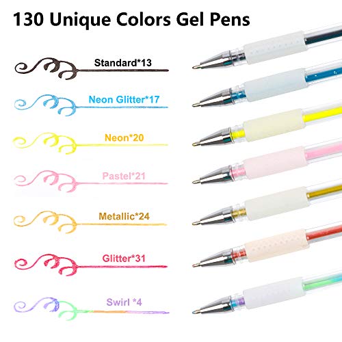130 UNIQUE COLORS & 1 BONUS COLORING BOOK: Shuttle Art gel pens set has 130 individual vibrant colors, including 7 types of colors: 31 glitter, 20 neon, 17 neon glitter, 24 metallic, 21 pastel, 13 standard and 4 swirl. ANOTHER coloring book will be provided for adult relaxation.