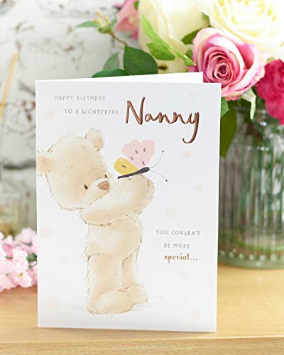 Send some love to a special nanny on her birthday with this cute nanny birthday card, featuring Nutmeg the bear and copper foil lettering