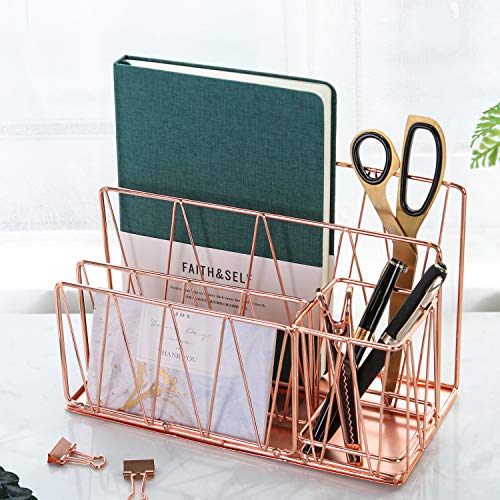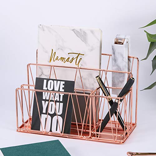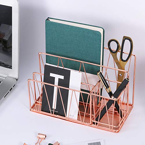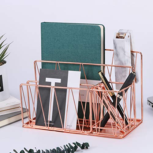 Nugorise Letter Sorter with Pen Holder, 3 Slot Mail Organizer for Postcards, Notebooks, Files and Accessories, Rose Gold Desktop Home Office Supplies Storage Rack