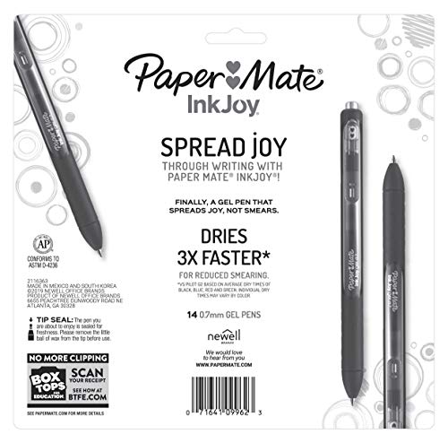 Spread joy (not smears) with Paper Mate InkJoy Gel Pens. With vivid gel ink that dries 3X faster for reduced smearing, it’s like a party on the page where smudges aren’t invited. Brilliant color ensures your writing will be bright and filled with fun. Fully wrapped with a comfort grip, these gel pens have a smooth style that keeps the joy flowing as fast as your thoughts. These smooth writing pens are a perfect addition to your back to school supplies, office supplies, and the fast dry time makes it the ideal pen for journaling and drawing! vs. Pilot G2 based on average dry times of black, blue, red, and green. Individual dry times may vary by color.