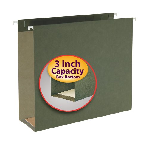 Smead’s Box Bottom Hanging File Folders are created to keep your documents upright and to reduce bulging in your filing cabinet. These standard green folders are designed for drawer use, ideal for manuals, booklets, bulky files, catalogs, business directories and media. Each box includes 25 letter-size (11-3/4” W x 9-1/4” H) extra capacity file folders. Sturdy 11 point stock keeps papers intact. Sturdy reinforcement strip keeps contents upright and enables storage of bulkier items, allowing for folder contents up to 3” thick. Tabs for labeling not included. Coated rod tips allow smooth gliding. Customize your hanging folders with Poly Hanging Folder Tabs (64615 – sold separately). Proudly made in the USA. Contains 10% recycled content, 10% post-consumer material and is SFI Sourcing Certified. Available in standard green and assorted colors for easy color-coding. • A Rich Heritage of Innovation and Quality. A world-leading provider of solutions for efficient document management, Smead is a woman-owned company well-known for its high quality, environmentally responsible products and innovative organizational systems. For more than a century, Smead has been committed to one purpose: Keeping You Organized!