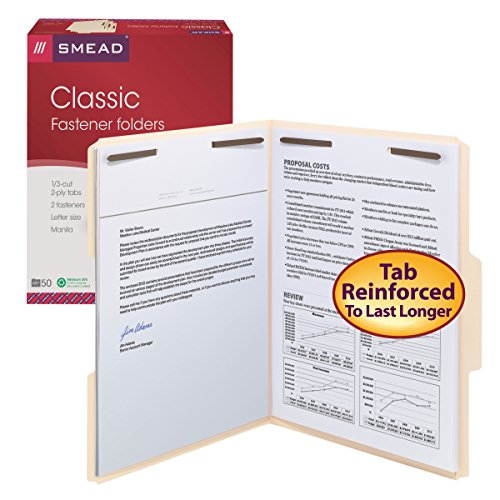 Smead Fastener File Folder, 2 Fasteners, Reinforced 1/3-Cut Tab, Letter Size, Manila, 50 per Box (14537)