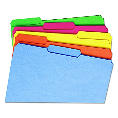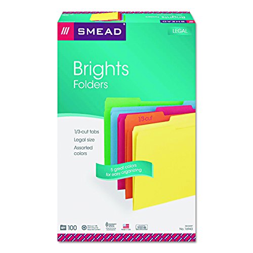 Includes 100 legal size (14-5/8″ W x 9-1/2″ H) colored folders with assorted position 1/3-cut tabs