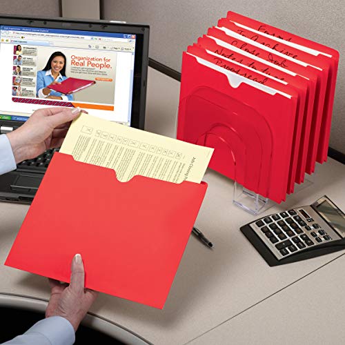 Keep project documents safe, organized and within reach with Smead’s File Jackets! This set of red file jackets is the perfect choice for organizing and color-coding different types of files to save you time and frustration. An excellent solution for document security, these bright file jackets are well-suited for storing photos, documents, charts and X-rays. Each letter size file jacket folder has a reinforced tab and closed sides to keep your materials from slipping out, making them a great choice for taking files in and out of the office. The straight-cut tab offers ample space for describing the contents and provides a large area for labeling. Proudly made in the USA, these 11 pt. colored stock file folders contain 10% recycled content, 10% post-consumer material and are SFI Sourcing Certified. For additional convenient document storage, consider adding one of our Self-Adhesive Poly Pockets (68185 – sold separately). • A Rich Heritage of Innovation and Quality. A world-leading provider of solutions for efficient document management, Smead is a woman-owned company well-known for its high quality, environmentally responsible products and innovative organizational systems. For more than a century, Smead has been committed to one purpose: Keeping You Organized!