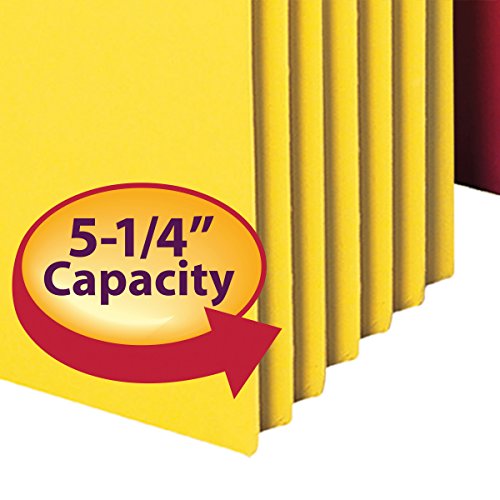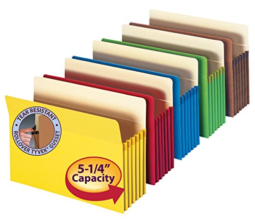 Smead File Pockets help keep large amounts of paperwork neatly organized and secure. Great for desk, drawer, shelf and on-the-go storage. Also ideal for use with storage boxes. Accordion style sides expand 5-1/4″ and hold up to 700 sheets. File pockets take up minimal space, expanding only when extra storage capacity is needed. Top of the gusset is reinforced with tear resistant material for extra strength and durability. Color code files for easy identification. Straight-cut tab provides a large visible labeling area. Includes 5 letter size (11-3/4″ W x 9-1/2″ H) file pockets with 5-1/4″ expansion. Color assortment includes 5 1 each blue, green, red, yellow and redrope. Contains 10% recycled content, 10% post-consumer material and is SFI Sourcing Certified.