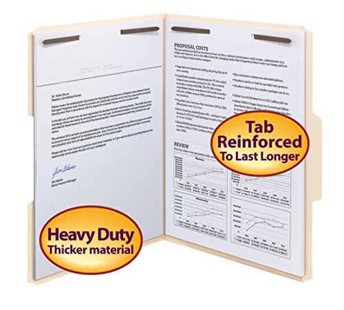 Keep papers secure and in order, even when folders are handled by lots of people and transported out of the office. Subdivide documents with ease. Create two separate filing surfaces with fasteners on the front and back panels. Two 2″ prong K style fasteners per folder in positions no. 1 and no. 3. Made of a heavyweight 18 point paper stock for long-lasting durability. Scored for 3/4″ expansion. Includes 50 letter size folders (11-5/8″ W x 9-1/2″ H). Each folder has a reinforced 1/3-cut tab in assorted positions. Proudly made in the USA. Contains 10% recycled content, 10% post-consumer material and is SFI Sourcing Certified.