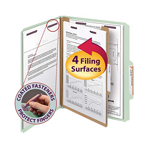 Minimize the time you spend searching for documents and increase the efficiency of your filing system. Smead’s Pressboard Classification File Folders with SafeSHIELD Fasteners make it easy to organize your critical information by providing 4, 6, 8 different filing surfaces that can be used to separate your documents in subcategories and keep them in proper sequence. Purposefully designed to provide a solution for the most common fastener issues, our Pressboard Classification File Folders feature SafeSHIELD Coated Fasteners that help you avoid hand injuries, ripped papers and excessive fastener crinkling. To ensure you have instant access to your important papers and nothing gets misplaced, each letter size top tab classification file folder in this 10-pack includes 1 sturdy divider and SafeSHIELD Fasteners on all 4 filing surfaces. The 2/5-cut tab in right of center position is compatible with our Viewables Multipurpose Labels (64915 – sold separately) and the 2″ expanding spine made of tear resistant material offers greater storage capacity for bulky projects. • A Rich Heritage of Innovation and Quality. A world-leading provider of solutions for efficient document management, Smead is a woman-owned company well-known for its high quality, environmentally responsible products and innovative organizational systems. For more than a century, Smead has been committed to one purpose: Keeping You Organized!