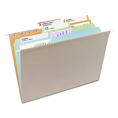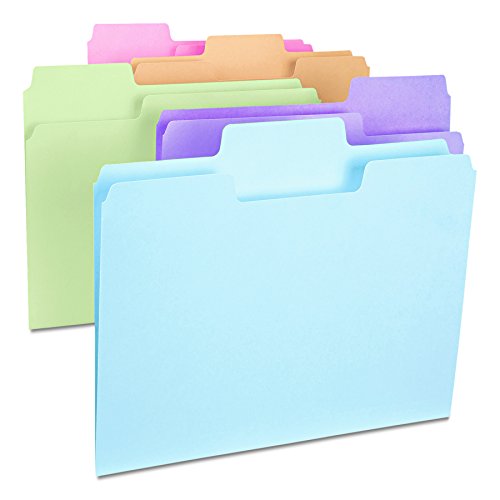 Includes 100 letter size (11-5/8″ W x 9-1/2″ H) folders. Each folder has an oversized 1/3-cut tab in assorted positions. Color assortment includes Camel, Lake Blue, Lavender, Moss and Pink