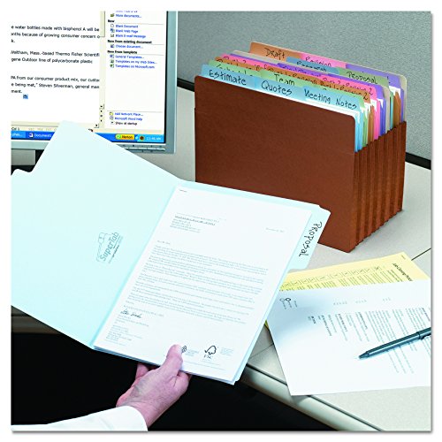 Find critical files fast with SuperTab folders. Nearly double the labeling area of standard folders, so you can write larger or fit more lines of text. Each folder is scored 3/4″ for greater storage capacity. Great for everyday use! Made of 11 point colored paper stock. Includes 100 letter size (11-5/8″ W x 9-1/2″ H) folders. Each folder has an oversized 1/3-cut tab in assorted positions. Color assortment includes camel, lake blue, lavender, moss and pink. Proudly made in the USA. Contains 10% recycled content, 10% post-consumer material and is SFI Sourcing Certified.
